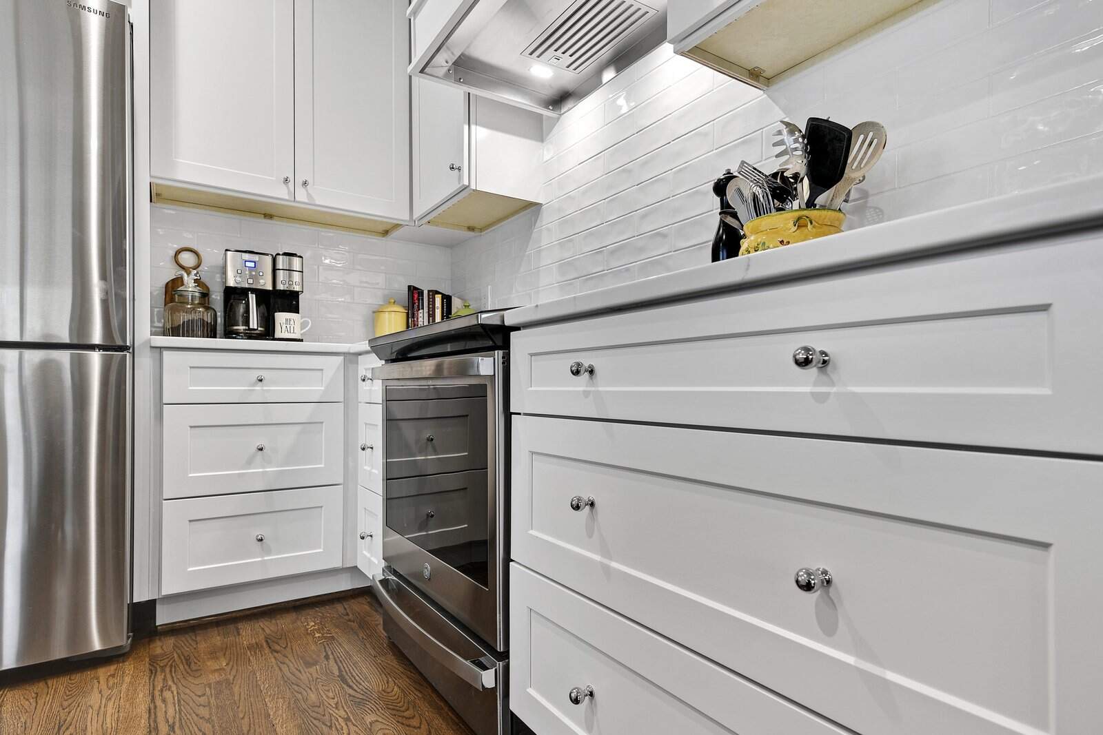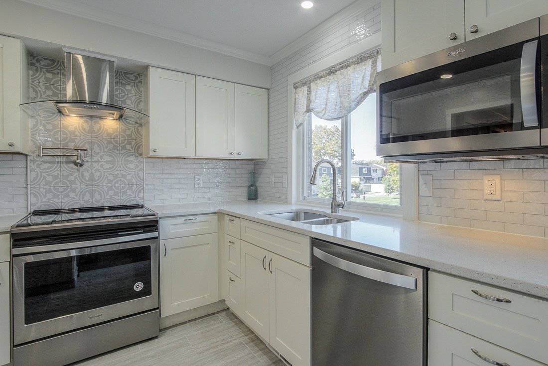 Modern kitchen with white custom cabinets, stainless steel appliances, and stylish backsplash.