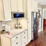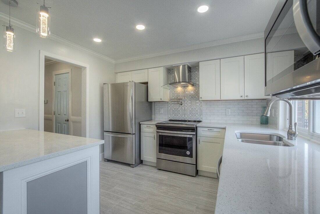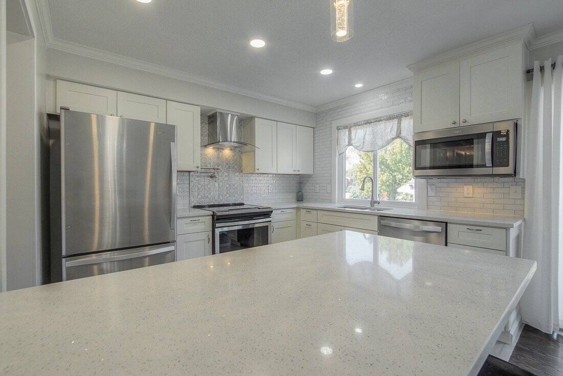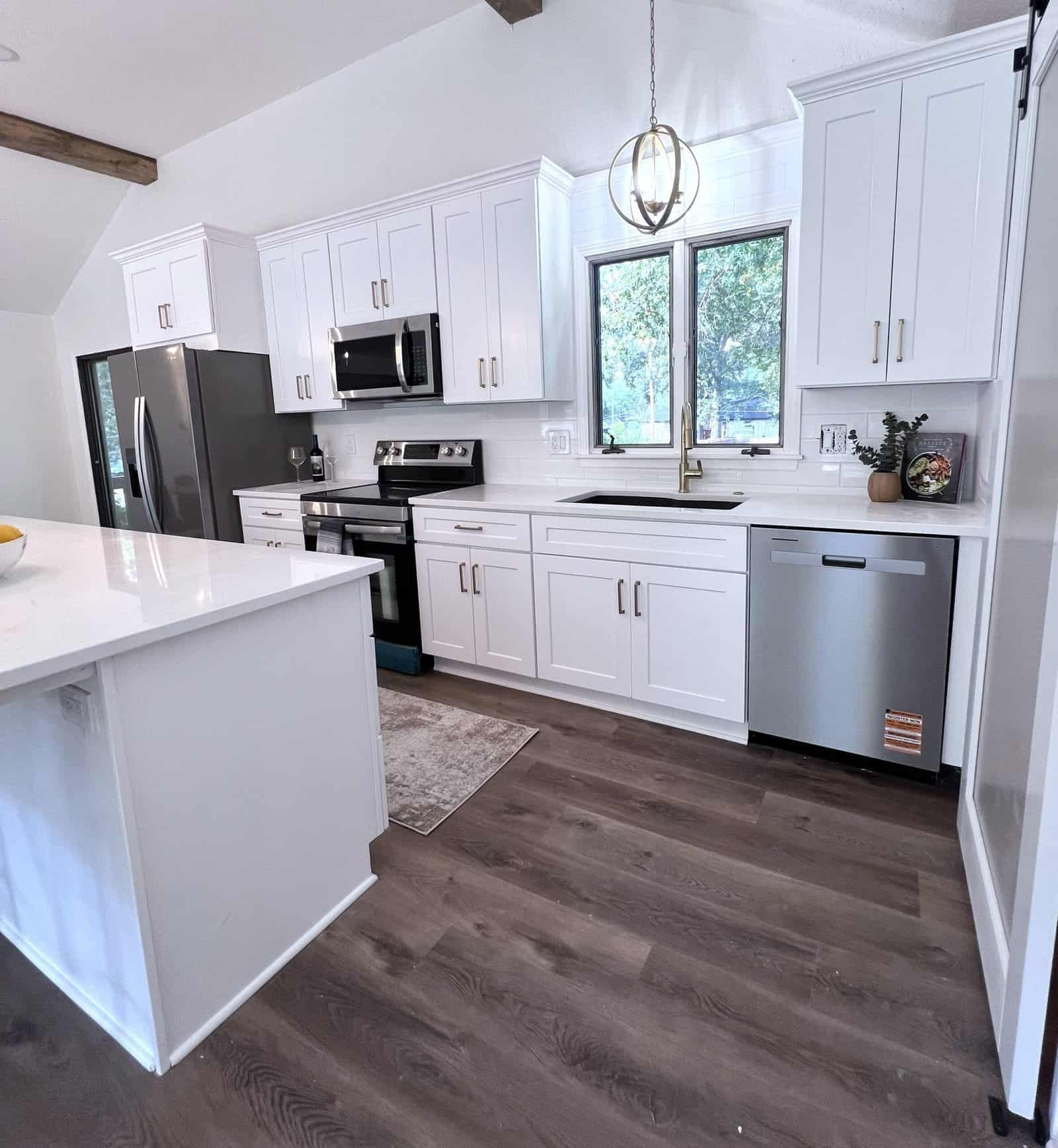 Stylish white kitchen with custom cabinets, durable countertops, and stainless steel appliances.