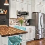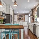 Contemporary white kitchen cabinets with brick backsplash and turquoise accents.