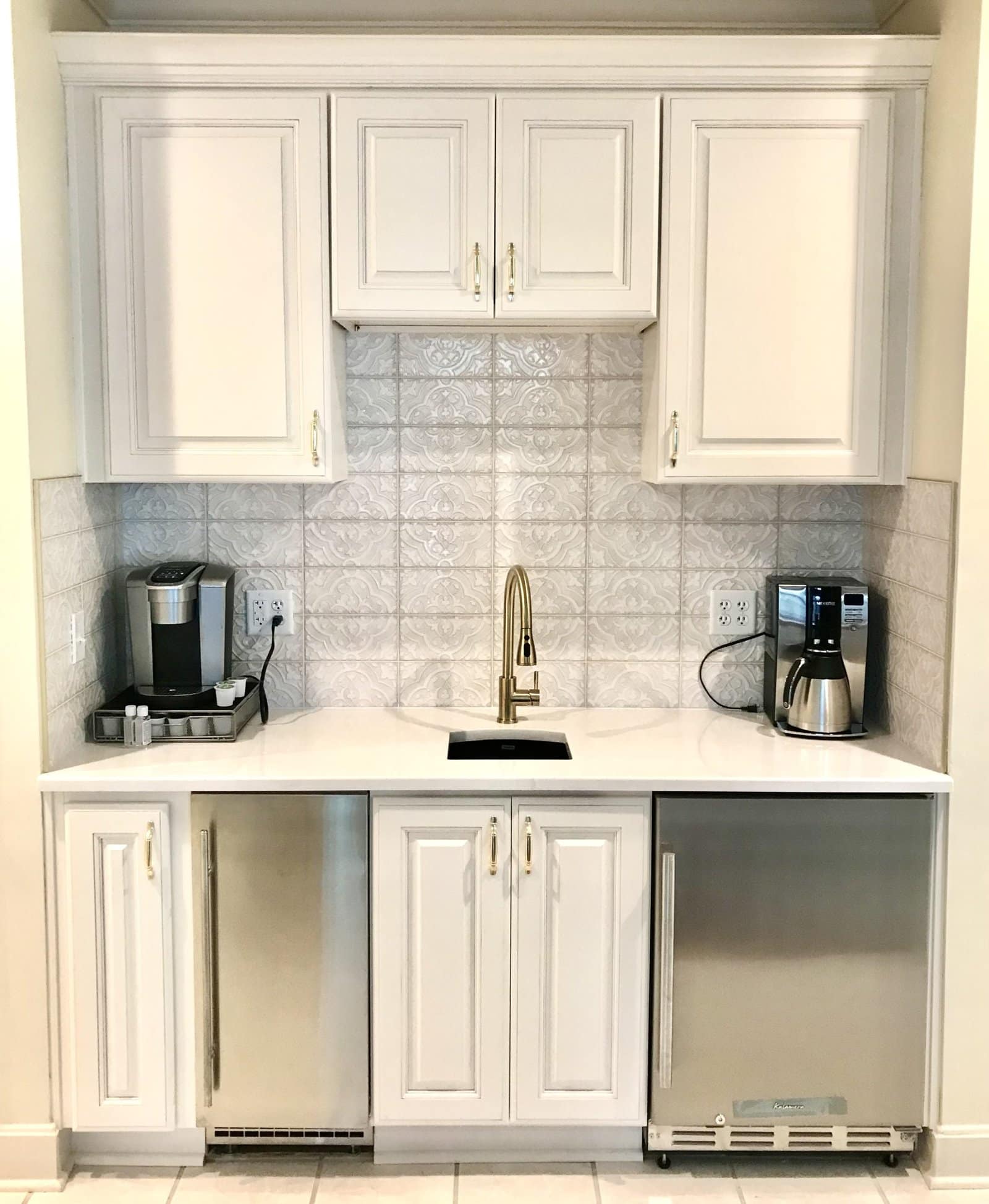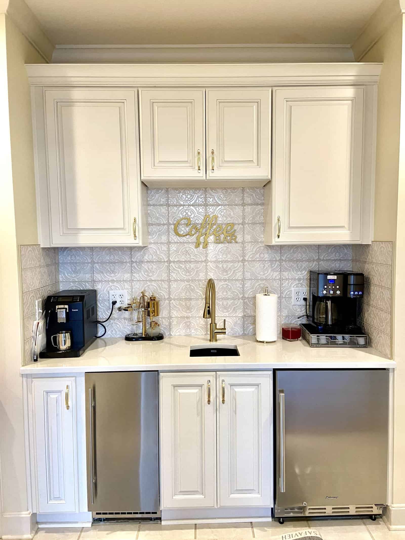Charming white kitchen cabinets with stylish gold hardware and built-in mini fridge.