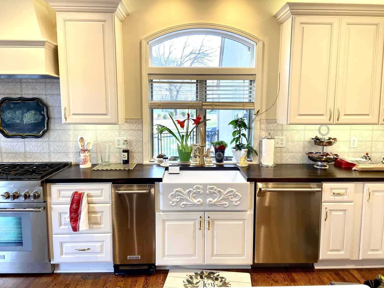 Bright and stylish kitchen featuring custom white cabinets, a black sink, and natural light, highlighting premium cabinet design and quality.