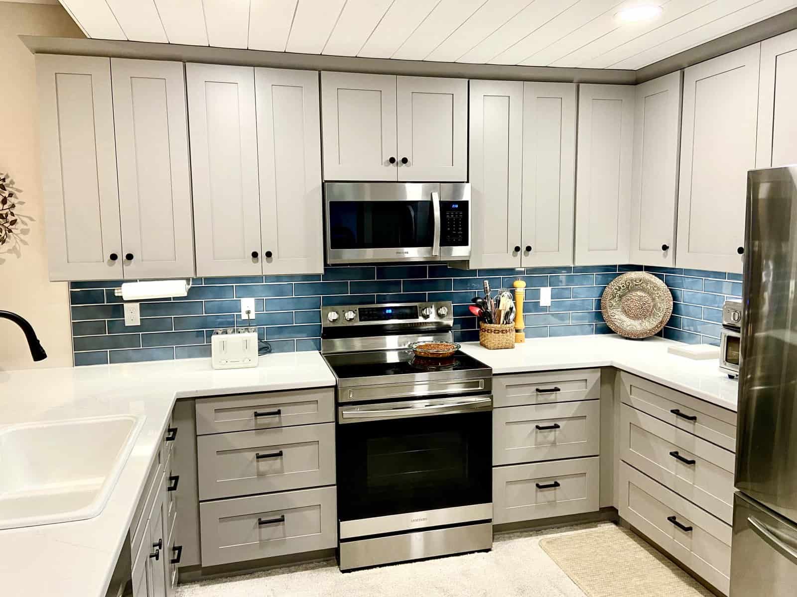Elegant custom cabinets in a bright kitchen setting with blue backsplash accents.