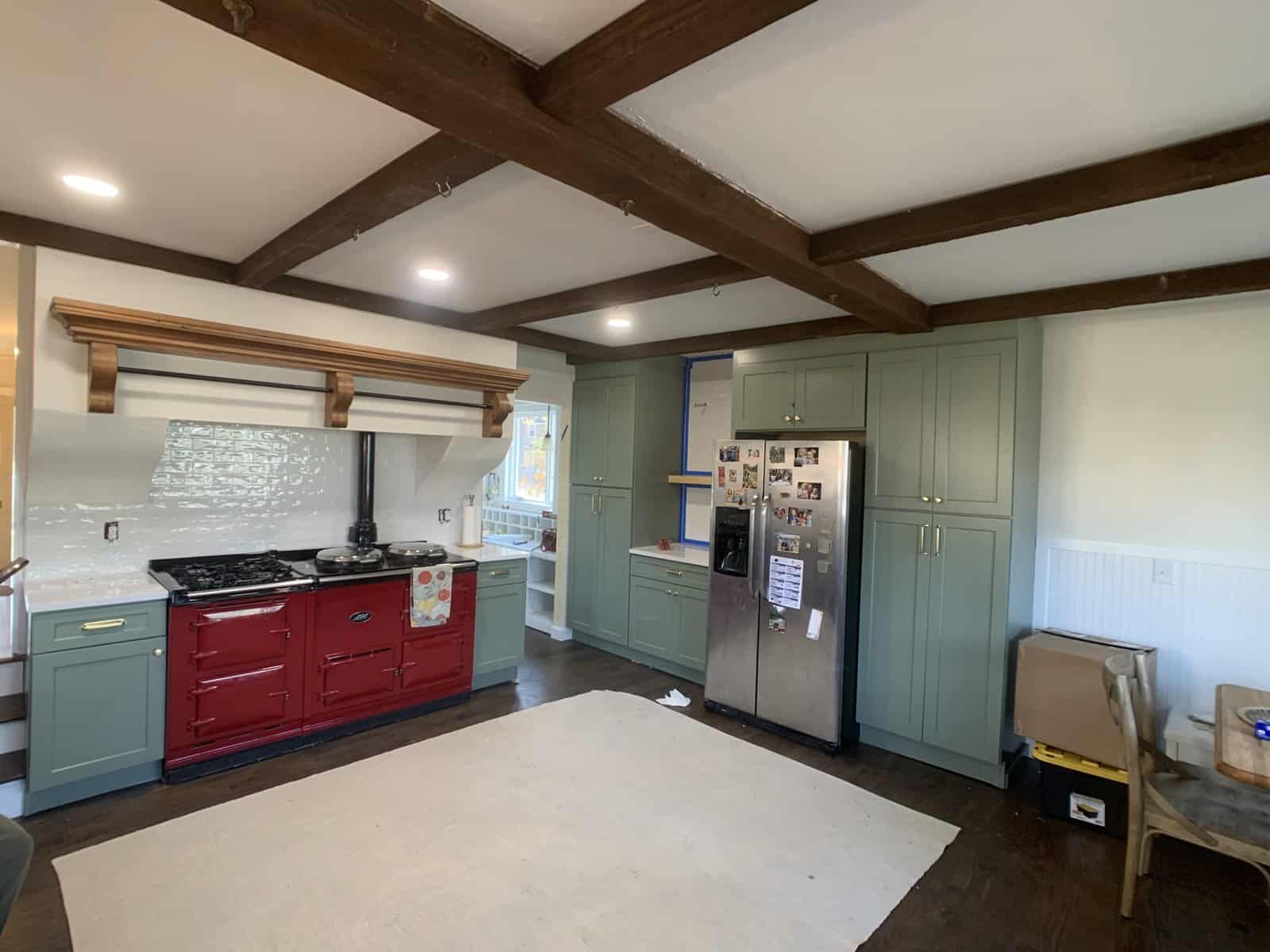 Elegant custom kitchen cabinets with green paint and a red vintage stove, top-quality cabinetry for stylish kitchen remodels.