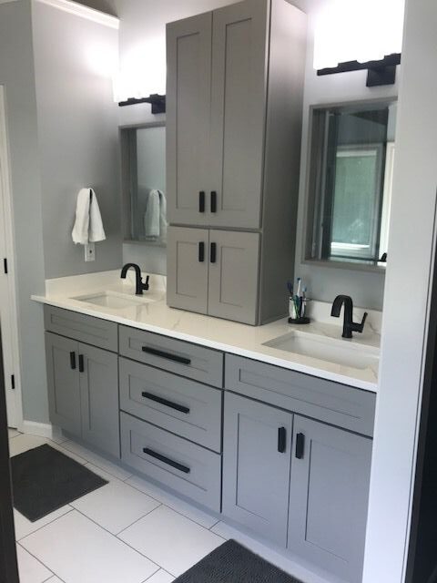 Elegant gray bathroom cabinets with black hardware and dual sinks for stylish bathroom renovation.