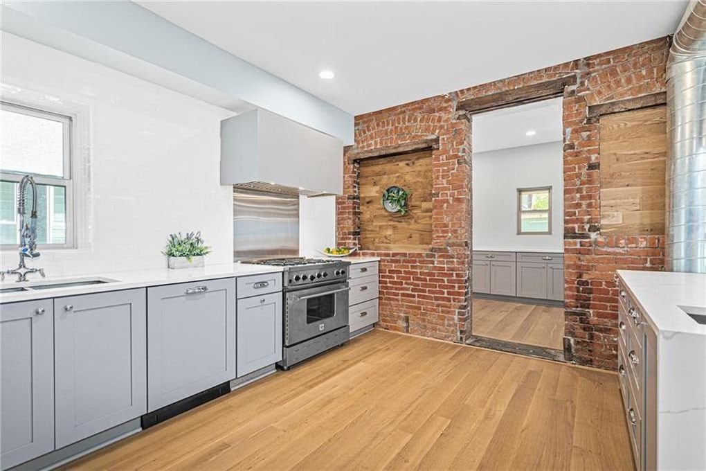 Chic kitchen featuring custom white cabinets, exposed brick wall, and sleek stainless steel appliances.