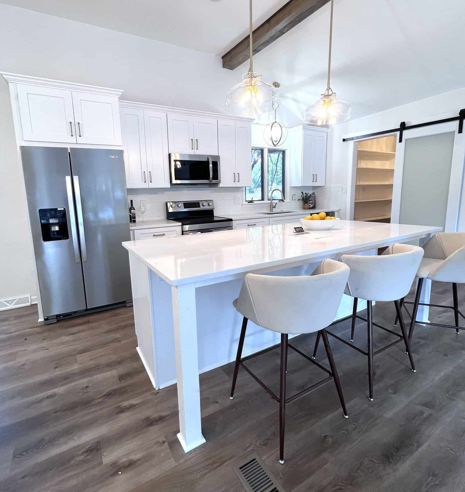 Modern kitchen with white cabinetry, stainless steel appliances, and premium cabinets from Overland Park Cabinets.