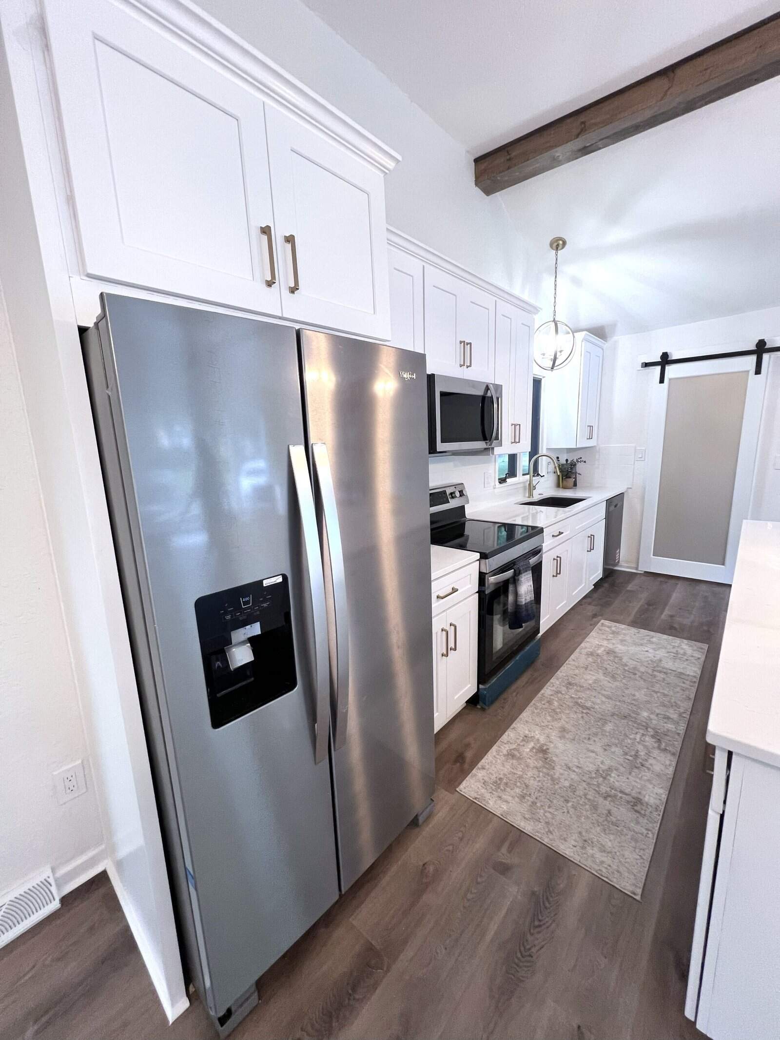 Bright white kitchen cabinetry with modern appliances and hardwood floors for a stylish, functional space.