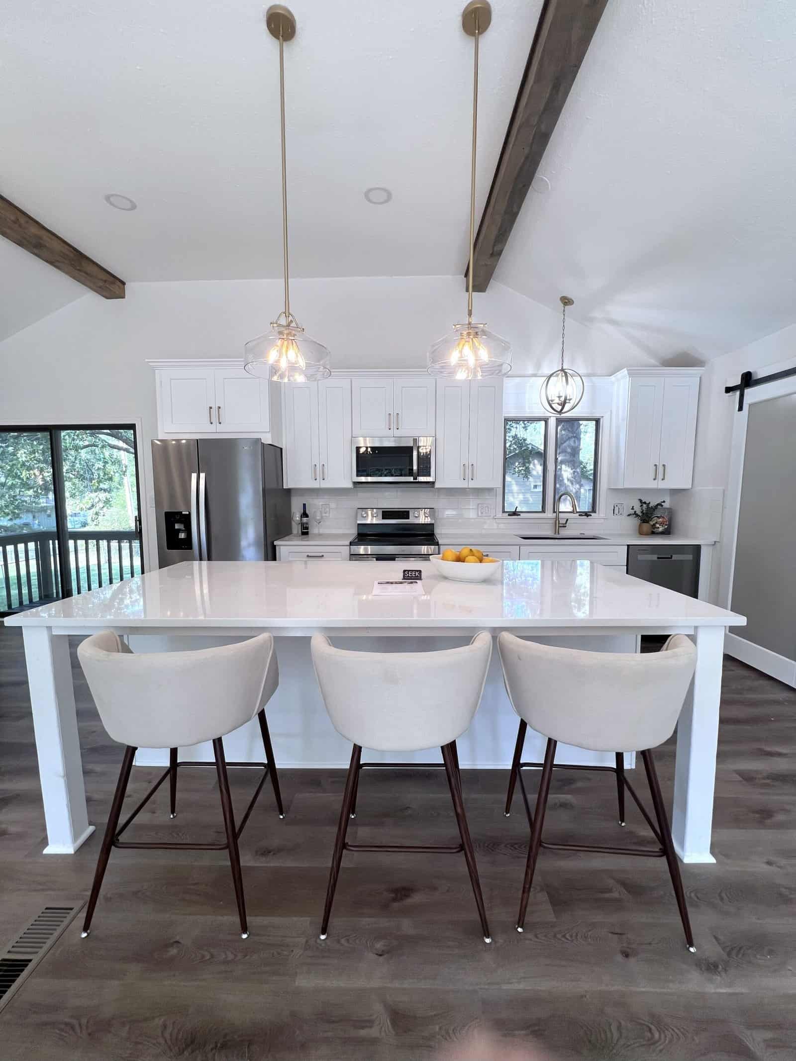 Elegant white kitchen cabinetry with modern gold handles, spacious island, and cozy farmhouse decor.