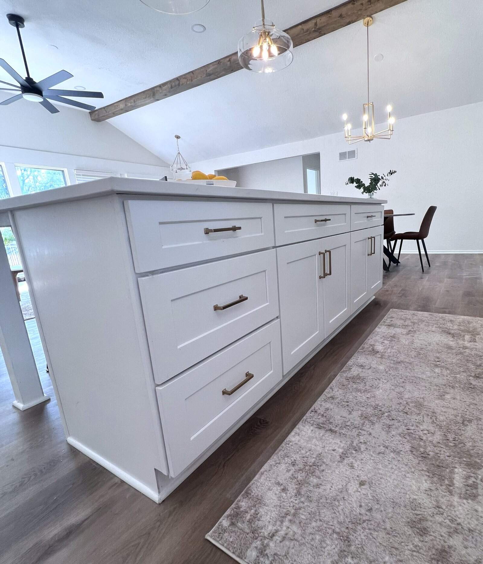 Beautiful white kitchen island with sleek hardware in a modern living space.